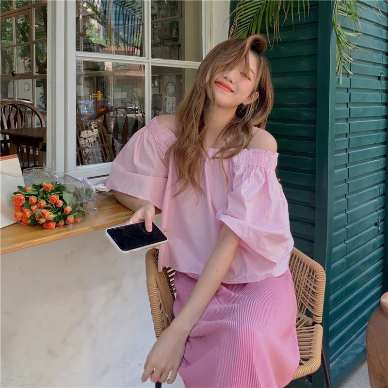 ブラウス サマーストラップレスショートシャツ 薄手 ピンク 大人ガーリー スウィート キュート カジュアル 夏物 香港の味58679961791