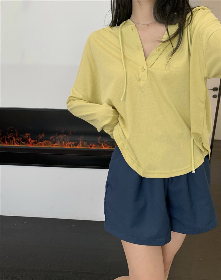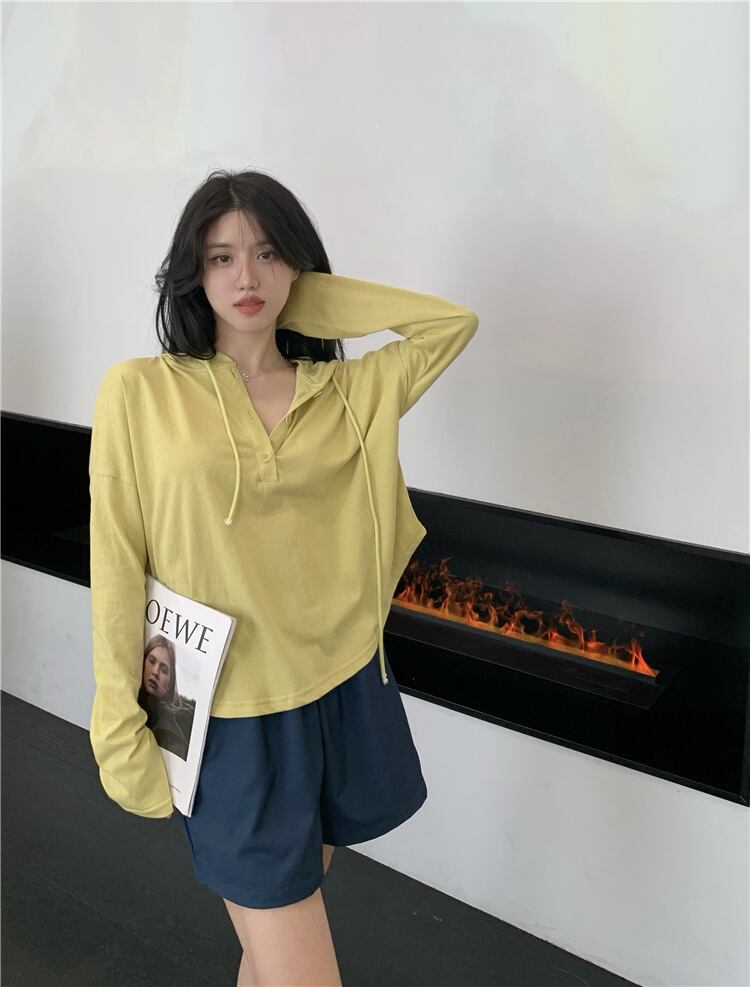 フードTシャツ シャツ カラーギャザーサマールーズ薄手スタイルソリッド トップス ロング 夏物 ソリッドカラー 香港の味49282120830