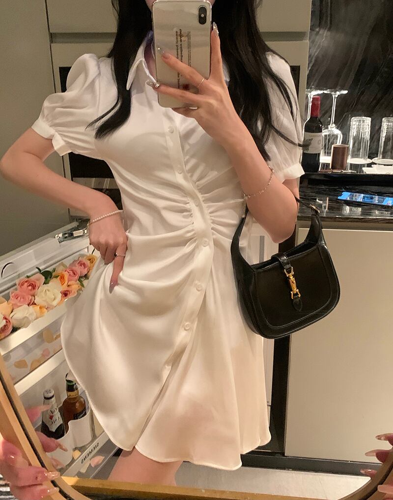 サテンスリーブドレス レディースサマーシャツ ウェスト薄手スカート 夏物 香港の味2289107366