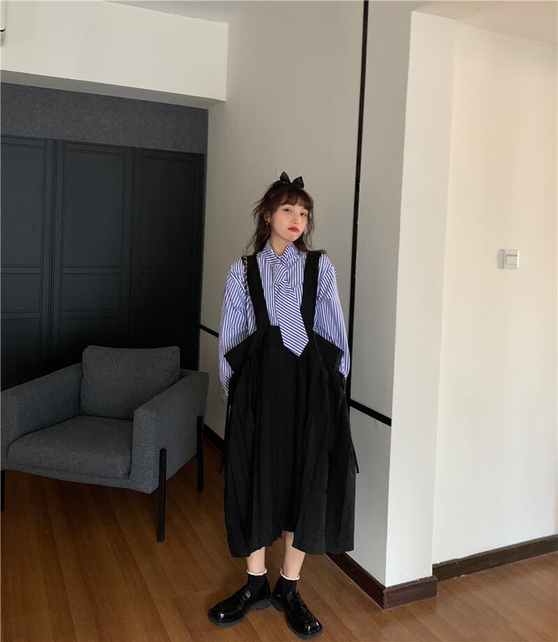 色:青いシャツ,ストラップドレス