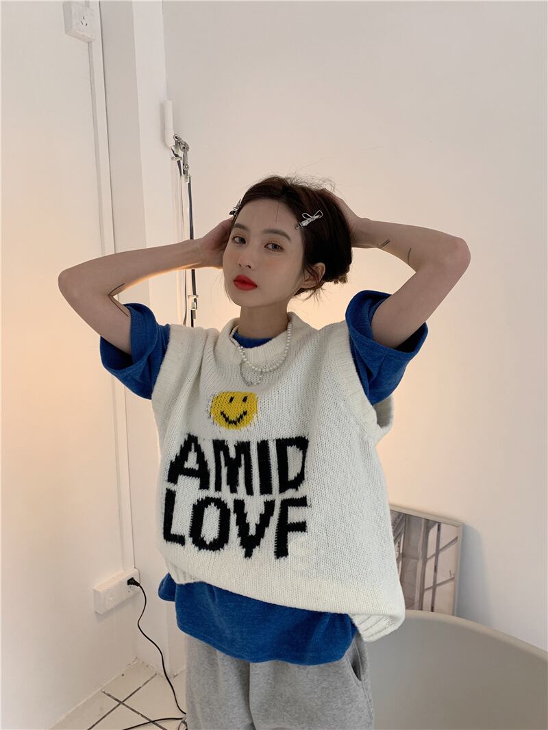 ルーズラウンドネックニットスプリングノースリーブジャケット 春物 Oネック 香港の味85382003436