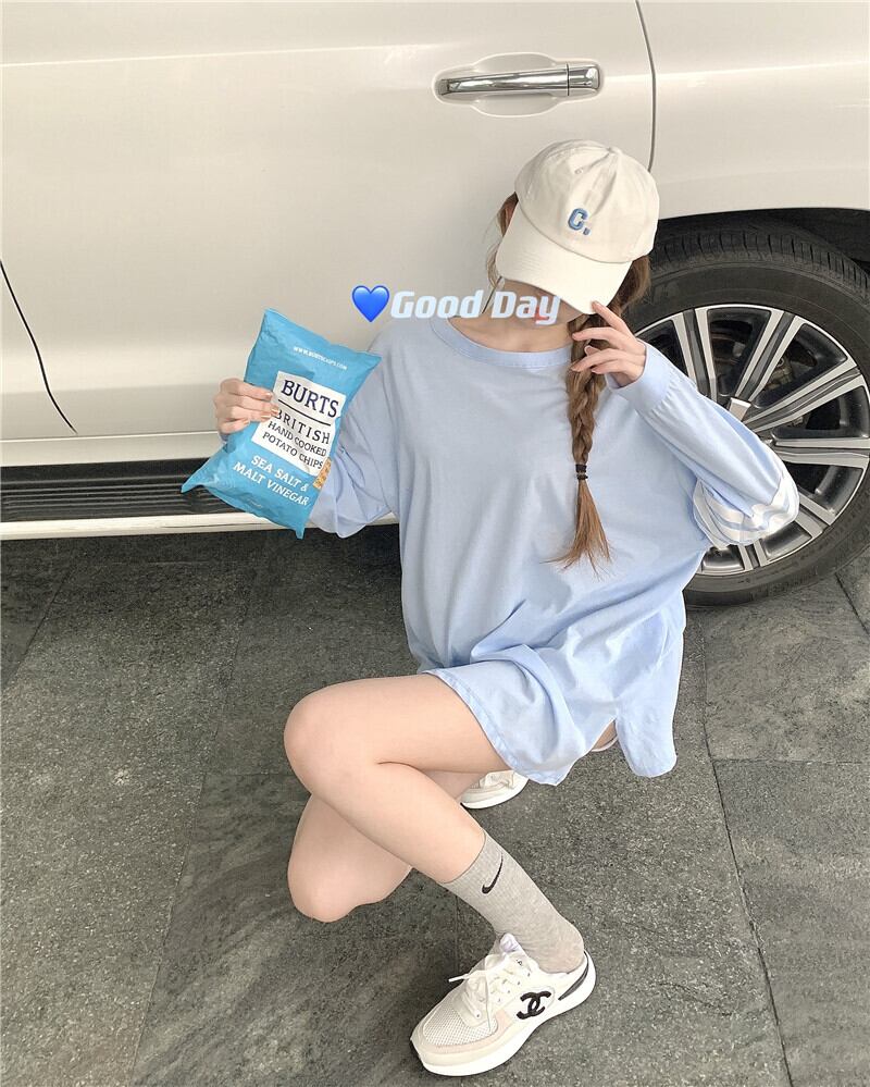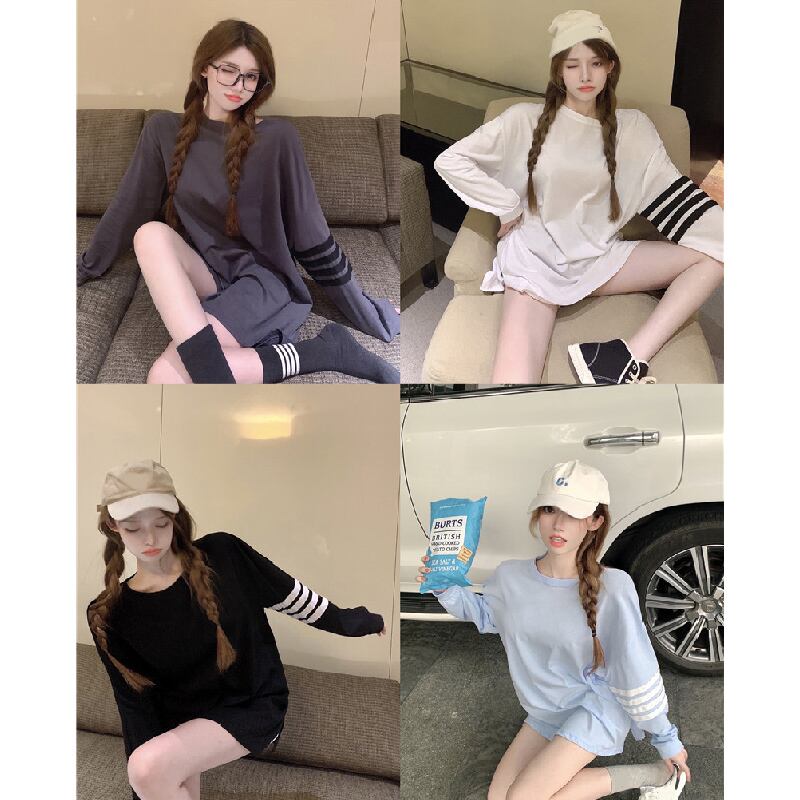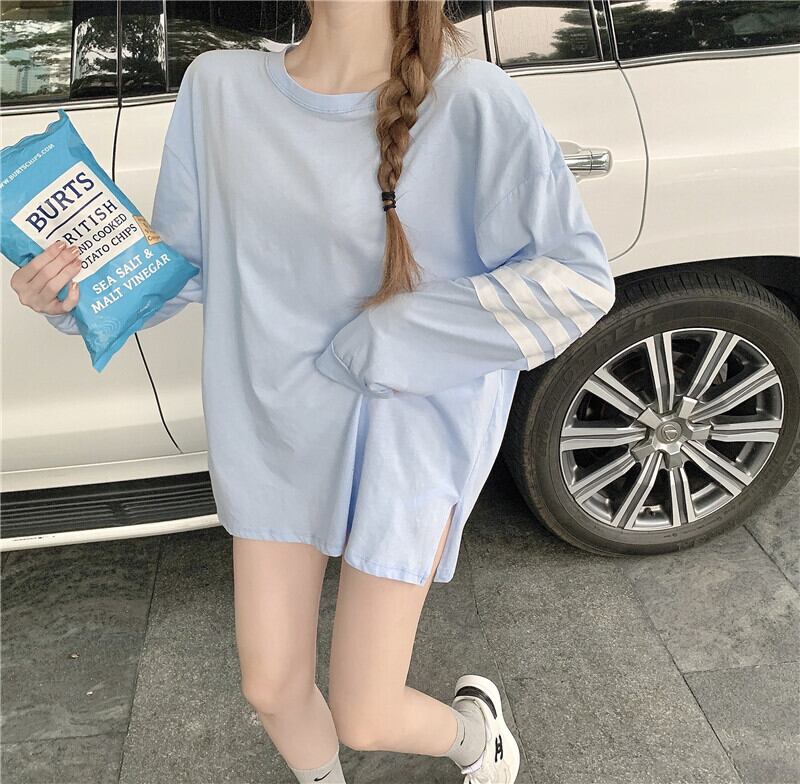 スタイルTシャツ カラーストライププリントオータムルーズラウンドネックカジュアルトップス ロング 秋物 Oネック 香港の味74727858946