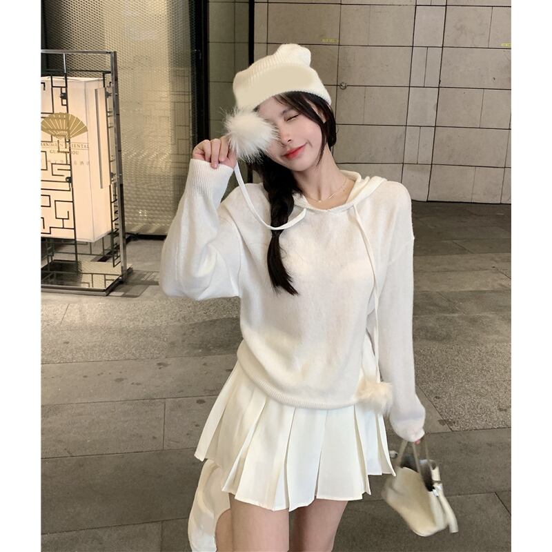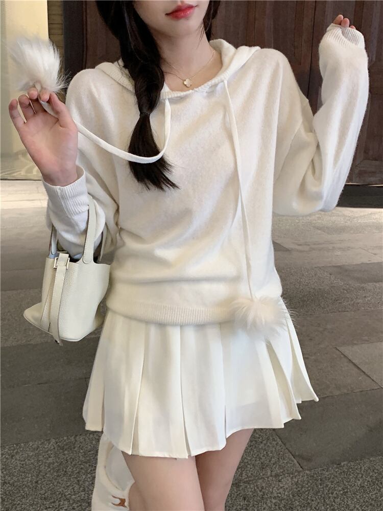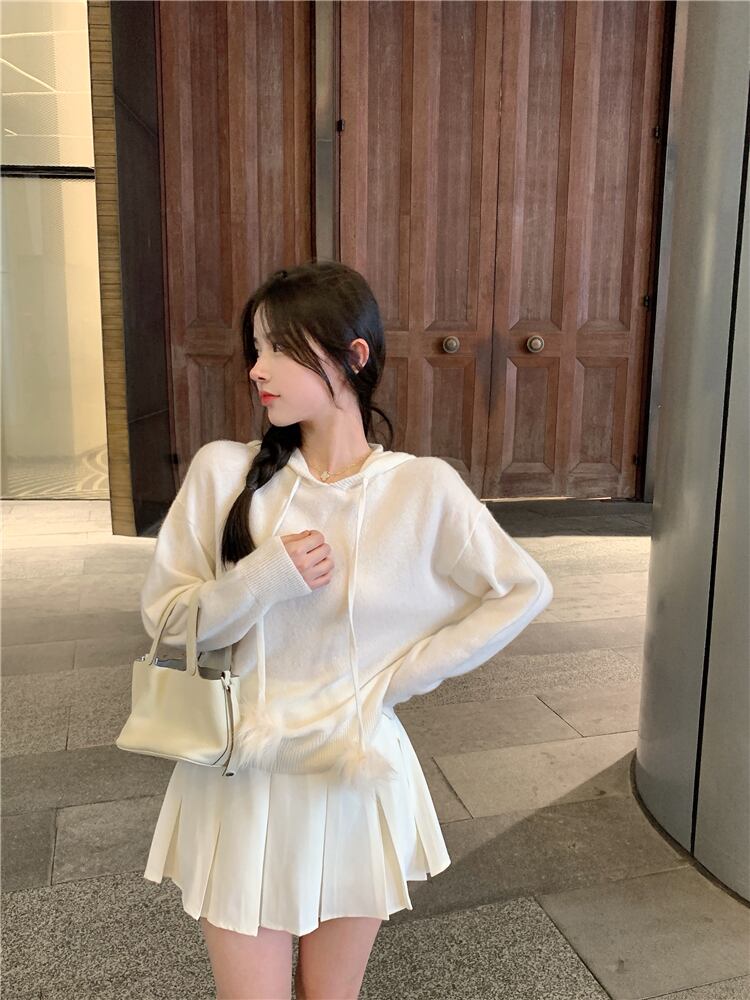 ニットフードセーター ベージュプリーツスカート 香港の味1283216507