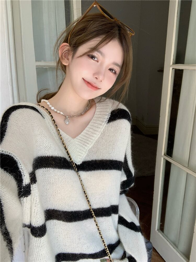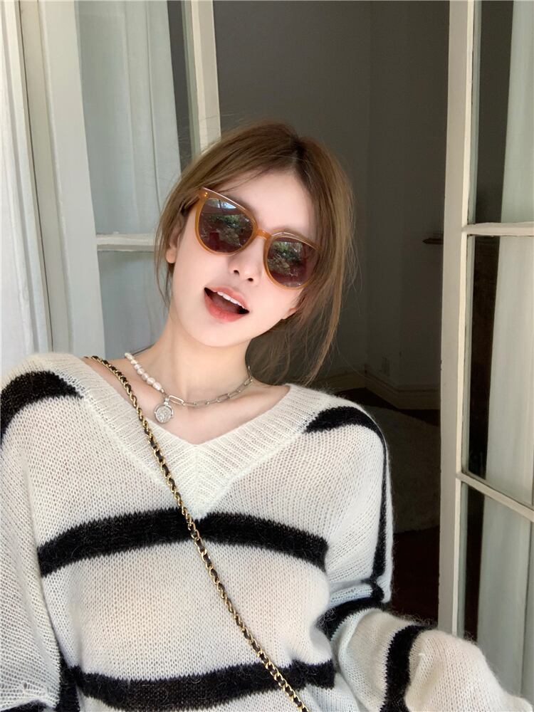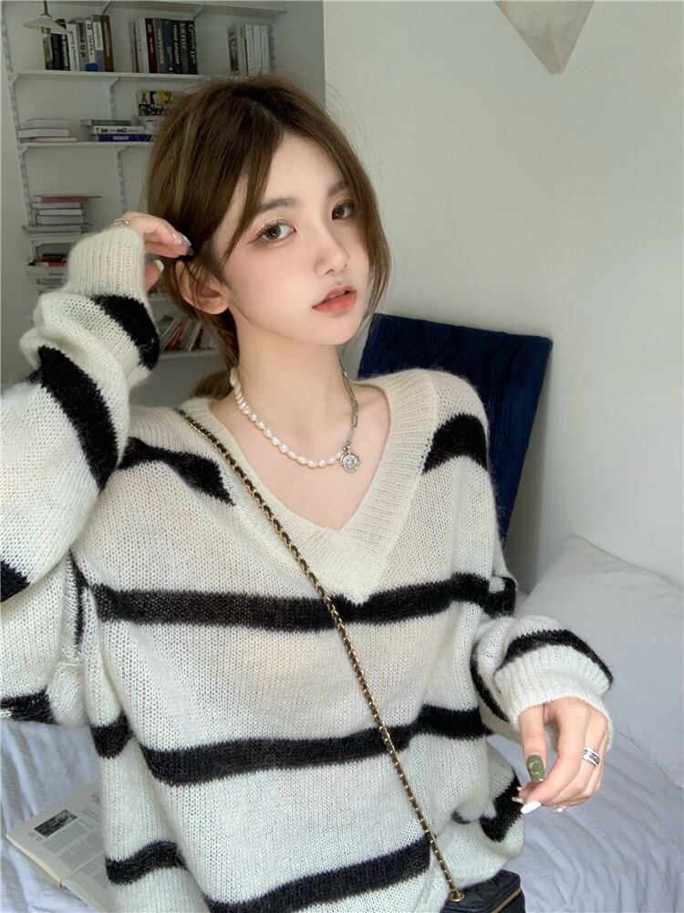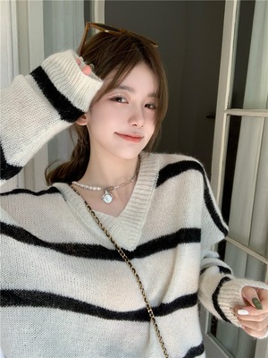 ストライプセーター Vネックオータムウィンタールーズスタンダードカジュアルトップス ロング レトロ 秋物 冬物 香港の味28394953336