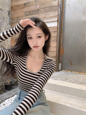 ストライプニットセーター 長袖スリーブオータムウィンタースタイルブラウス ロング 秋物 冬物 ピュア 香港の味19718385859