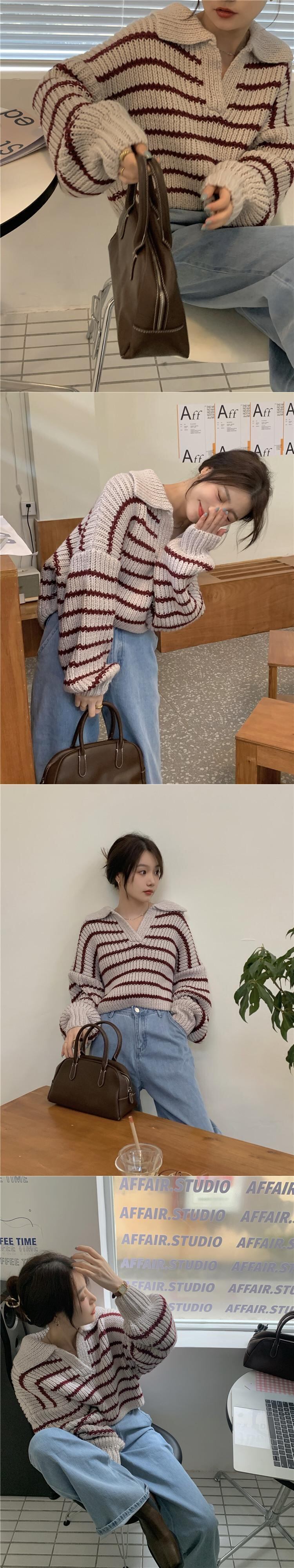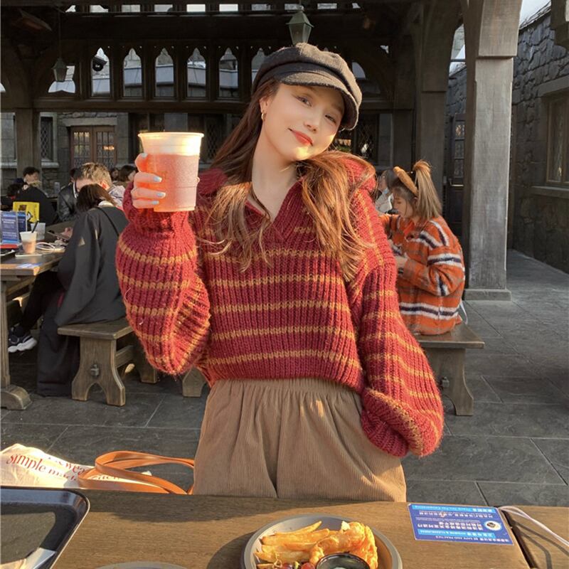 セーター ルーズストライプロングオータムウィンタースタンダードカジュアルトップス レトロ 秋物 冬物 香港の味69686109679
