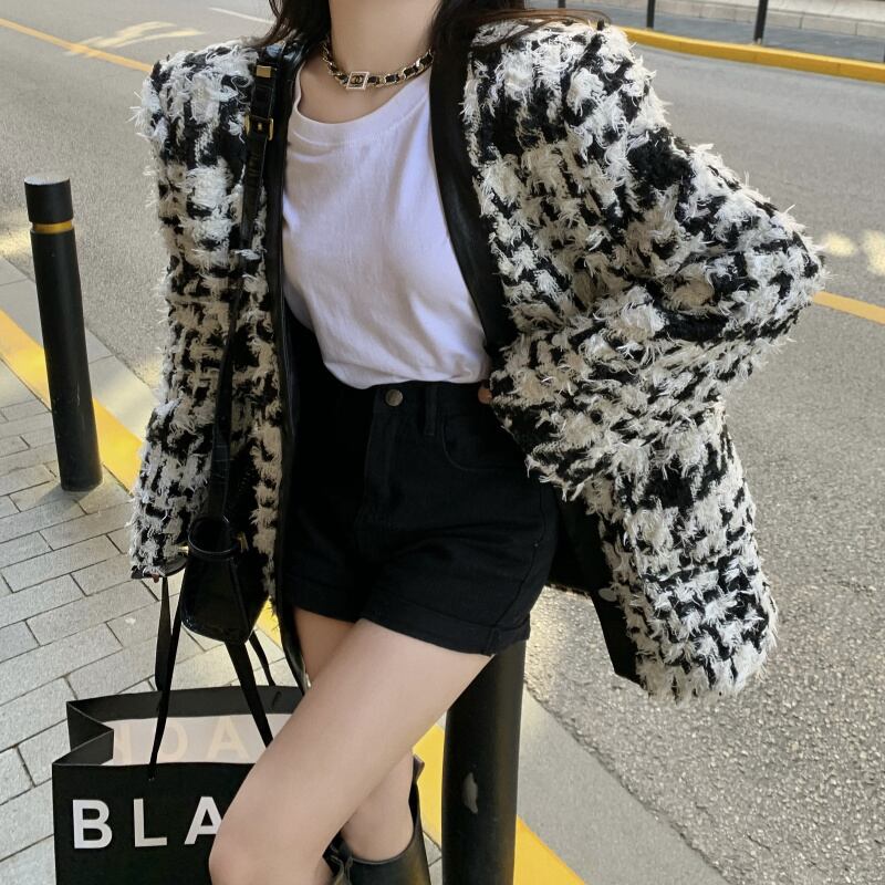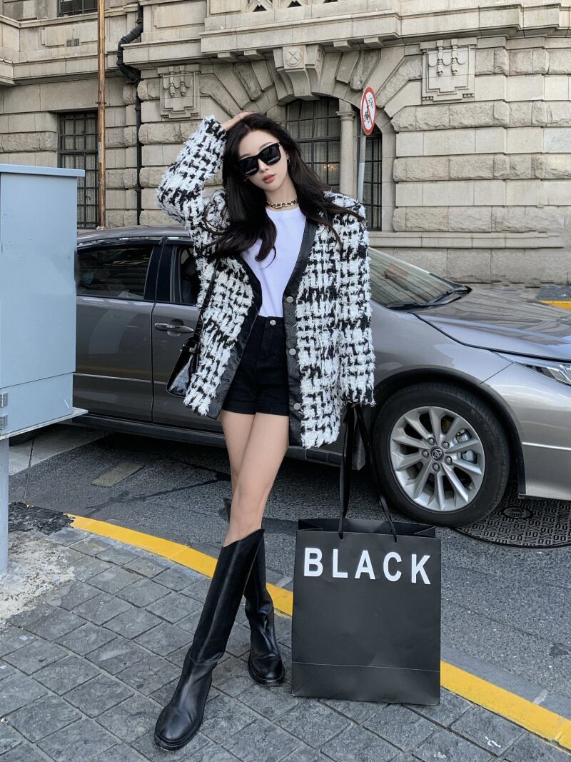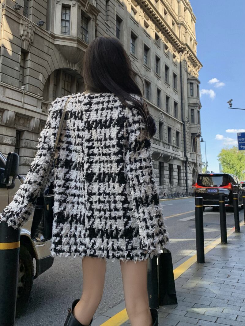 ツィードジャケット Vネックルーズオータムウィンタートップス ロング 秋物 冬物 香港の味15653386243