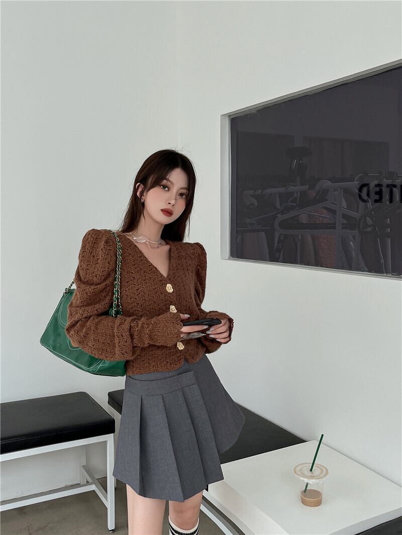 スタンダードスタイルレースVネックシャツ オータムショートウェストトップス ロング レトロ 秋物 香港の味70523069