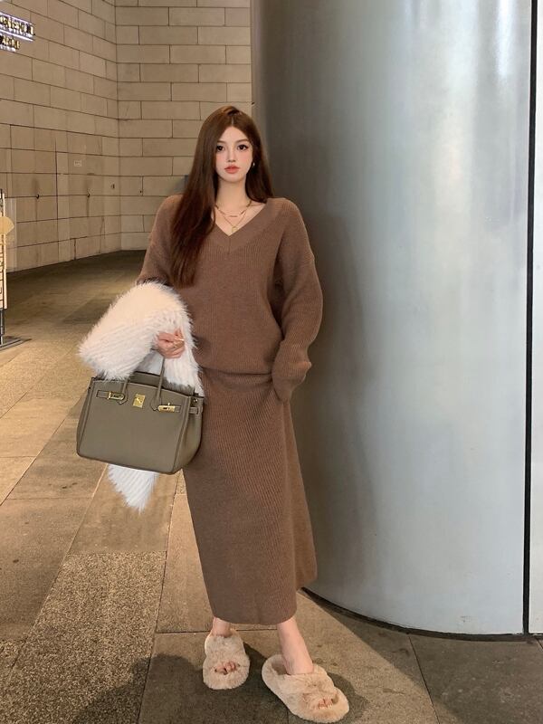 カーキセーター Vネックルーズロングオータムウィンタープルオーバー トップス 秋物 冬物 香港の味69937322851